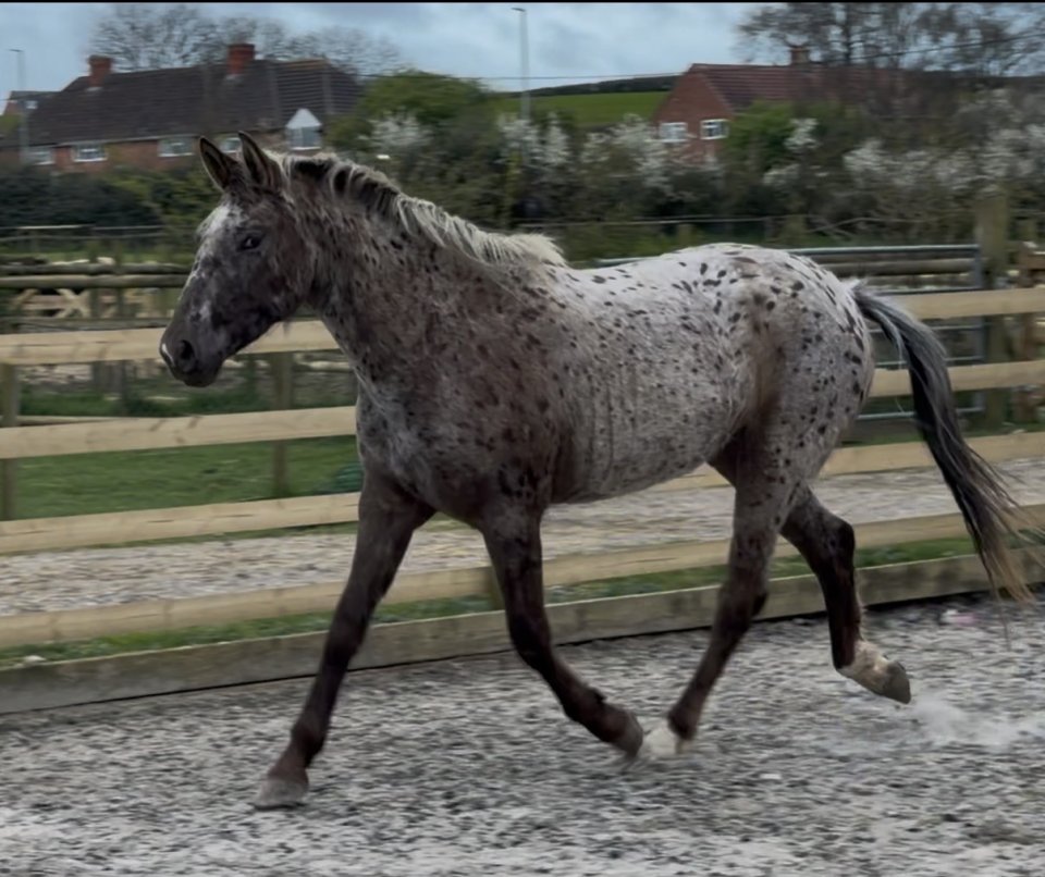 Very trainable, fabulous sports horse filly, sire can be seen at the Stud. Beautifully marked, chocolate spots, father Perlino PRE , mother pure bred appaloosa, exceptional movement would make a great competition horse. Registered as a pedigree Spanish Spotted Saddle Horse with.BAPSH. Both parents 16hh. Standing now at 14.2hh (rising 3- in May.) absolutely unique and a real head turner.£5950