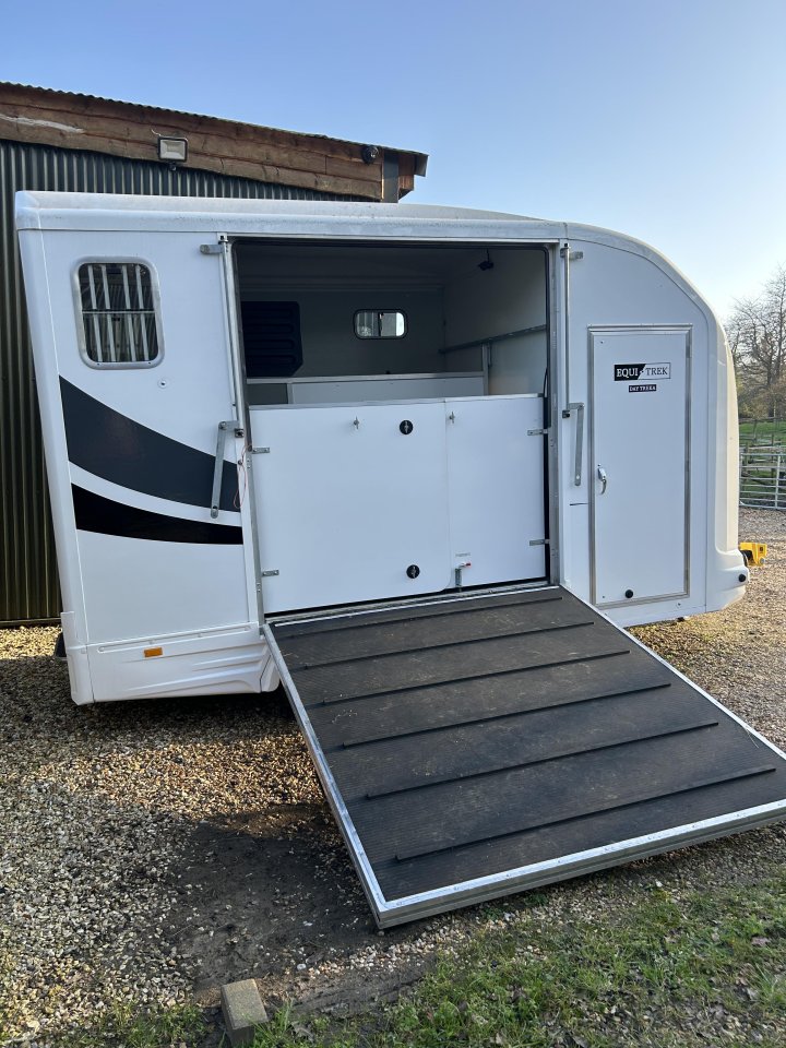 Equitrek space treka for sale.Good condition. Easy to tow. Wide easy ramp. Takes 2 large horses. Space for saddles bridles etc at the front. Space to saddle your horse while still loaded. Just been serviced. Has two sky lights that open for good ventilation. Good solid trailer £4300
