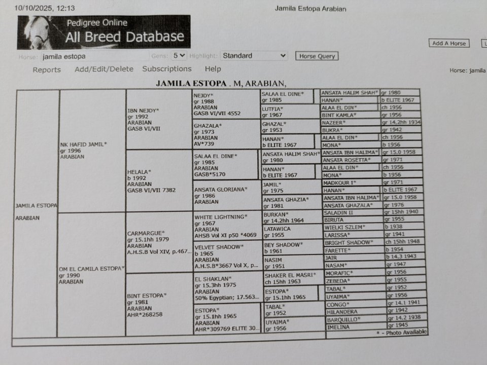 Unrecorded stallion x Jamila Estopa (see breeding chart)PBA registration due to above.Full history known, only 1 previous home and been with me for 8 years.Beautiful, trainable and loyal. Started professionally using natural horsemanship methods and liberty training in 2020. She responded to this extremely well. Has been ridden only intermittently since due to no rider. She is an intelligent mare who deserves to find a riding partner to become the wonderful ridden horse I believe she will be. Moves beautifully.Daily turnout and stabled at night, she had a bout of laminitis in October 2021 with no recurrence since then. However, she would NOT be suitable for 24-hour turnout as a precaution. She is fed a hay and fibre diet; her feet are extremely good with no lasting signs or issues.Up to date with vaccinations, worming (worm counts), dentist (no sedation needed) and farrier (trimmed 6 weekly). She has never been shod.She has excellent stable manners but is a typical Arabian mare who can pull all the faces (in the morning!). She has never bitten or kicked but needs someone calm and preferably with experience of this special breed - no novices - responds to a confident but kind hand. Ready to be re-started but should not take long. Therefore not for a ridden trial.She has been regularly led out in a halter (wonderfully light in hand), is good with all farm animals (pigs, sheep, donkeys, and dogs) and with all traffic seen, but we live in a quiet area. She is happy to be caught and leads in calmly – always with a smile in her rope! A brave mare who is not a reactive sort, taking all in her stride.A reluctant sale of this beautiful lady due to my age and health related issues.Can come with all her rugs.Torsion saddle and Equitex pad can be purchased separately if required.Happy to discuss all the above. Only 20 minutes from the end of M4 in South Wales. Easily accessible location.No dealers – for sale to a knowledgeable private home only.£3,000 – close offer considered for the perfect home – genuine enquiries only please.