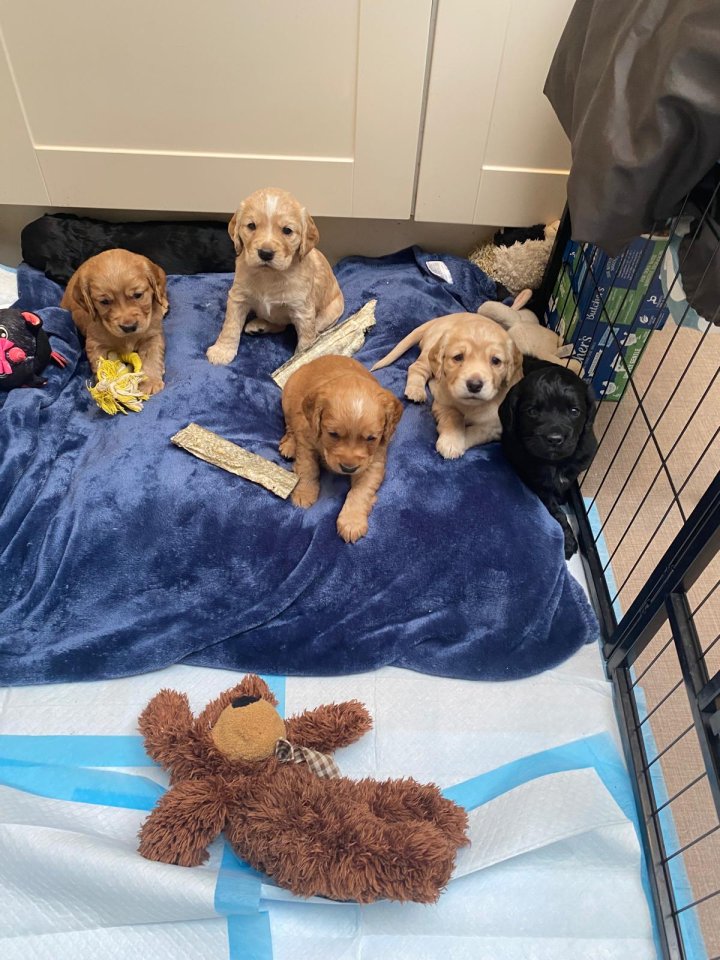 Our gorgeous cocker has had a litter of puppies. 5 girls and 1 boy. Born 26th August. All have lovely temperaments and great character. Brought up in the home and used to children. Wormed and flea treated. Will be microchipped and wormed again. Not KC registered or show dogs. Will be seen with mother. £850 each. Wimborne, Dorset. Please leave a message if phone is not answered immediately. 07917 843840 or 07917 844147.