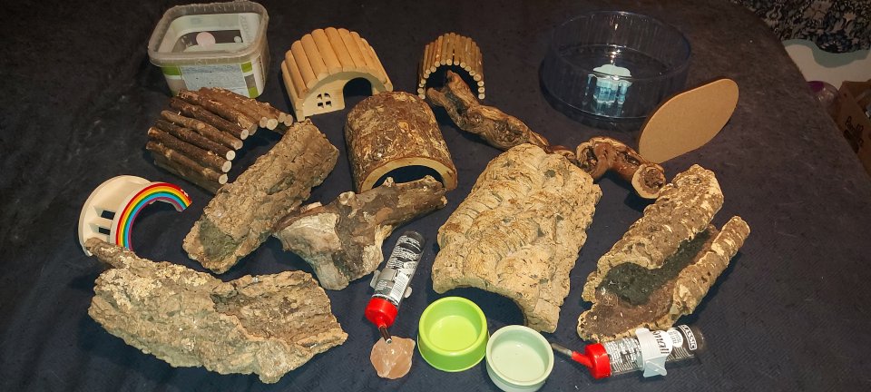 Pretty much a full set up for a very spoilt hamster. A large cage, plenty of accessories (bridges, houses, cork tunnels, logs), bedding (care fresh), food, treats, exercise ball and a super silent bucatstate exercise wheel! (Plus the tub we used with sand in for the toilet and the remaining sand - this made it very easy to keep the cage clean)There are a few gnaw marks here and there, but nothing that effects its use or security.Approx Dimensions: 49 cm Height, 56 cm depth, 96 cm width