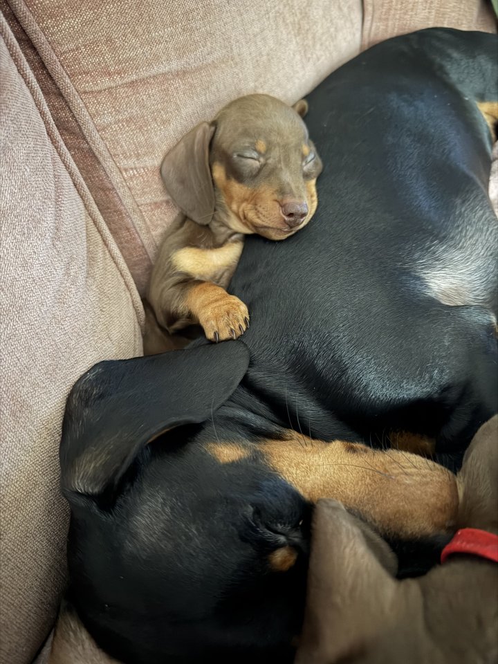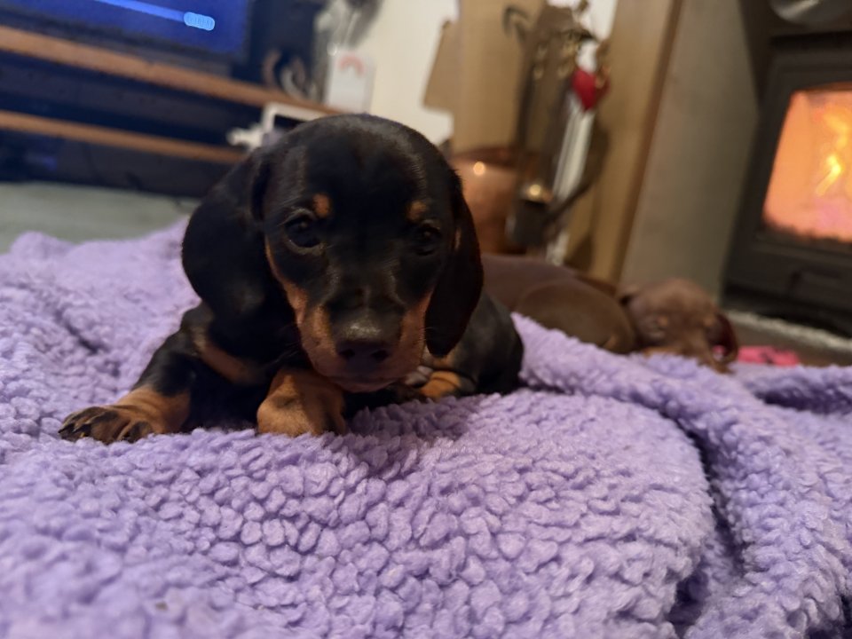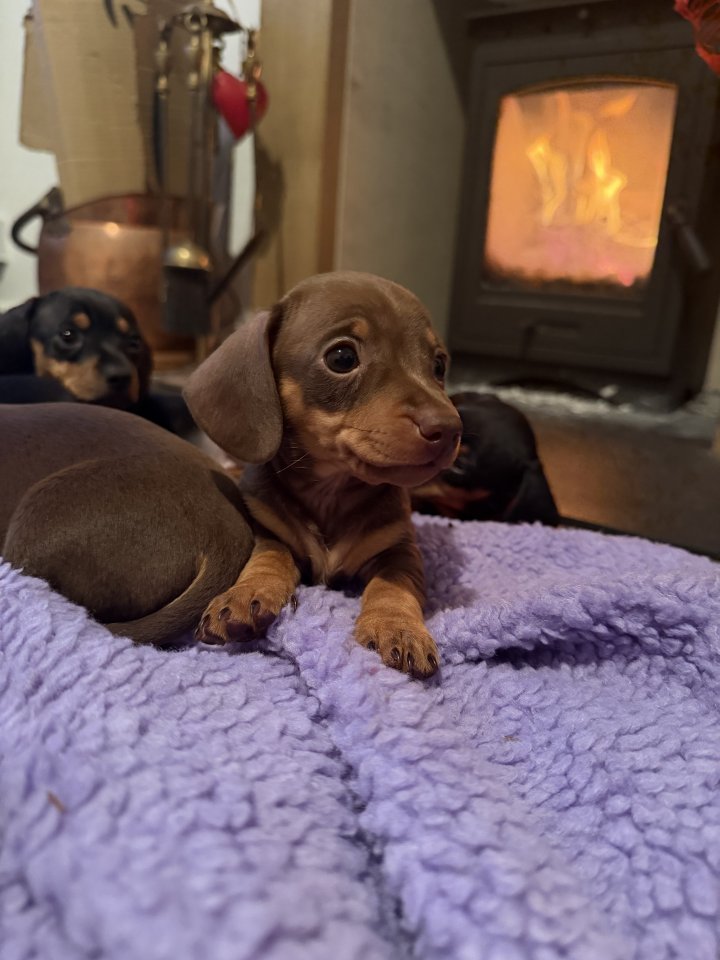 Both parents are family pets.Dad - kc miniature Black and Tan Mum - kc miniature (very very small) Black and TanPuppies will not be kc registered 1 x chocolate and tan girl. - Peggy1 x Black and Tan boy - David1 x Black and Tan girl - Matilda All puppies health checked alongside microchip and first vaccinationsPuppies all wormed at 2,4,6 and 8 weeks Both parents can be seen and cuddled 200£ deposit to be paid to secure puppy with balance on collection Puppies ready to go 16th January All puppies will leave with a bag of puppy food and a blanket Regular photos of your puppy will be sent until collection Used to all household chaos, regular nail clipping and holding, used to the hoover and carpet cleaner, and a very miserable cat!Puppies live in the living room as part of the family, have endless cuddles attention