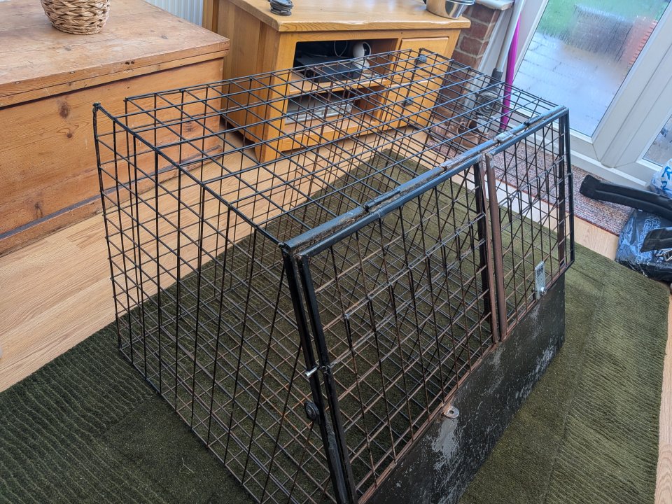 Metal dog crate for the back of your car. This has two sections and would fit small terrier/working cocker size dogs. The doors do not lock so you would need a bungee or caribena to keep shut. Dimensions:Length.....side to side....36"Bottom front to back....28.5"Top....front to back....17"Height....23"This is in very used but working condition, hence price of £30Collection only.