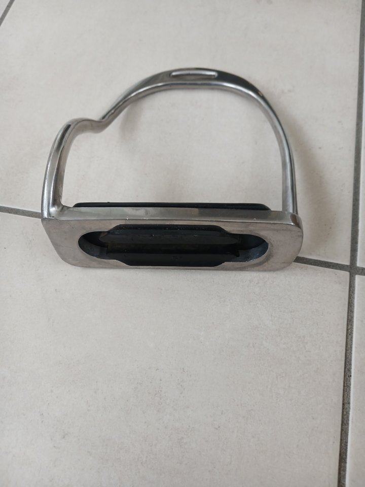 Pair of Shires 5" bent leg stainless steel safety stirrups, complete with 145cm long black stirrup leathers. All in good condition. £20
