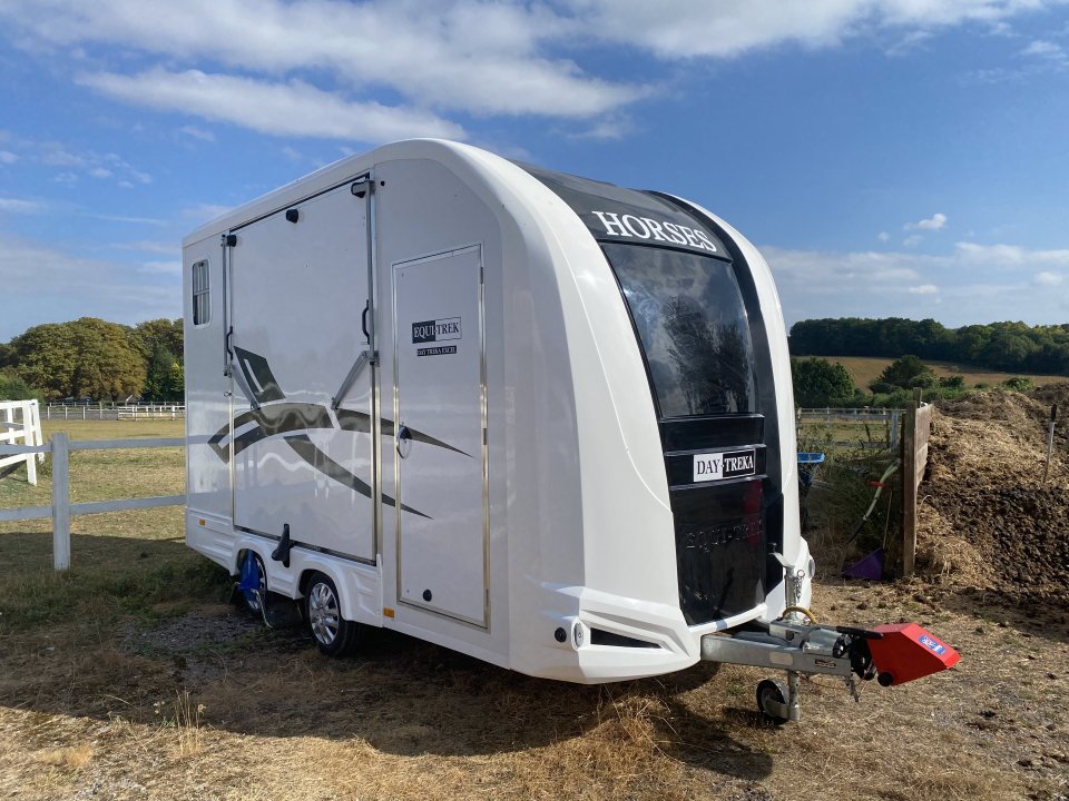 The perfect day trailer, the Day-Treka provides spacious rear facing travel for horses up to 18hh and a large changing and tack area for owners. Can be retrofitted with kitchen units/beds if required at an EquiTrek dealership. This trailer is wood free with a lightweight structure made from composite panels, which allows for a generous payload of 3000kg gross weight. The fully enclosed horse area boasts a fantastic 7feet 9inches of head room and a low wide side ramp for safe and easy loading. The large tack and changing area is totally separate from the horse area and features an interior light, two saddle racks, two bridle racks and two coat hooks, providing a practical space to store all the essentials required when you travel with your horse.Kept in very good condition, serviced annually, sold with recent Equitrek service and pressure wash. Horse video link and monitor included. £9500