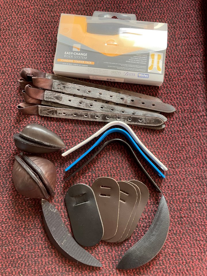 ACCESSORIES FOR WINTEC OR BATES SADDLESA standard starter pack of Bates or Wintec Shims – mostly unused £25.00 A number of 4mm and 8mm front shims available separately, either new or hardly used £5.00 per pair Two white, one blue and one black Bates or Wintec gullet plates £10.00 each1 pair of brown leather knee blocks for a Bates Saddle but suit Wintec too £15.001 pair of brown leather thigh blocks for a Bates Saddle but suits Wintec too £15.00Pair of synthetic knee block for a Wintec £8.002 pairs of ‘single’ leather girth guards in brown and 1 pair in black (Thorowgood) £5.00 per pairSet of 6 brown leather girth straps, to fit Bates or Wintec saddles £18.00 per pair