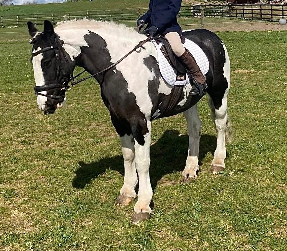 Piebald LW cob type mare rising 11 years a big full up 13.2 handsGenuine safe school mistress who turns her hoof to anything and everything.Loves her job, brilliant to hack, safe in all traffic.Full up 13.2hh 10 year old mare.If you’re looking for a safe, sensible family pony who can turn her hooves to anything, you may have found This gorgeous girl has been an absolute ‘heart pony’ and wonderful confidence giver, as well as the best teacher a child can have, she has taken her riders from lead rein through mini teams to confidently jumping 70!She has done pony club and everything from rallies, camps and beach rides to Area Competitions. She shows promise to do more in her dressage and is very balanced and polite and educated for a cobby type, and she loves cross country, adding many rosettes to the wall! She is also steady and reliable SJ, but isn’t the fastest!!She is easy to handle, clip, shoe and load. She has lovely feathers, we usually clip them off and keep her more streamlined. She has had her teeth routinely done, with no issues. Easy with other ponies and can hack out on her own and in company. She is good in all traffic, happily hacks alone or with others through cattle and a busy farm.Prior to us she was in the same home for four years, doing her job before she was genuinely outgrown and her riders moved on to a sportier model.She loves fuss and attention, and we are hoping to find her a home with a child who can already trot and canter but maybe has lost their confidence and is looking for a very special friend to hold their hand and help them enjoy riding again. Maybe with a small parent who can hack occasionally in the week although she doesn’t mind and is no different if ridden less.This is a very difficult decision. She is wasted with our son, she is just too nice a pony and loves the attention too much to be stood in the field, and our daughter just can’t manage the time for two ponies with ever increasing school and social commitments.She can be seen with a friend who has better facilities, so she can be tried in an arena and hacking etc.Please no time wasters. We are looking to find her a loving and caring new home hopefully over the school holiday.£8500 can be discussed to an amazing home and for an easy sale as this is hard enough