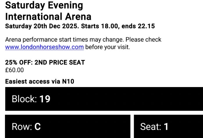 Due to unforeseen circumstances, I have 2 tickets for London International Horse Show on Saturday 20th December, evening performance. Selling at cost price, £60 each, Block 19, Row C, seats 1 & 2.