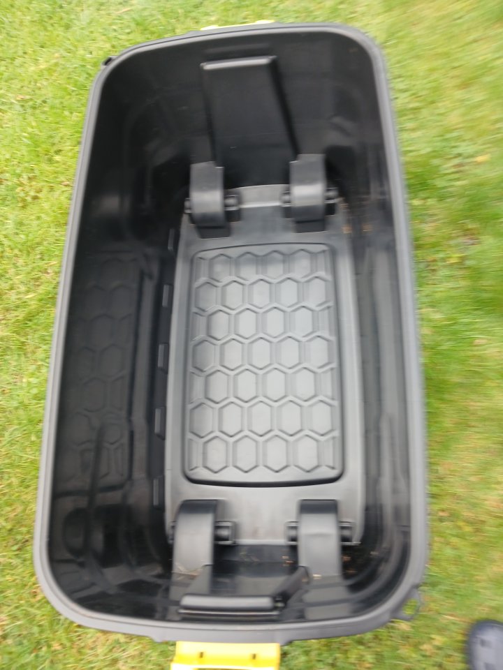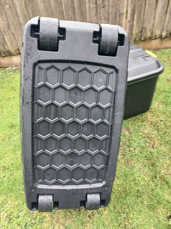 Two black plastic heavy duty storage boxes with wheels. 145 litre capacity, 90 cm long x 50 cm wide x 45 cm high. Complete with lid and security loop to fit a padlock. Both in excellent condition as only used for house move. £15 each or £25 for both.