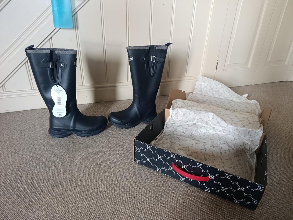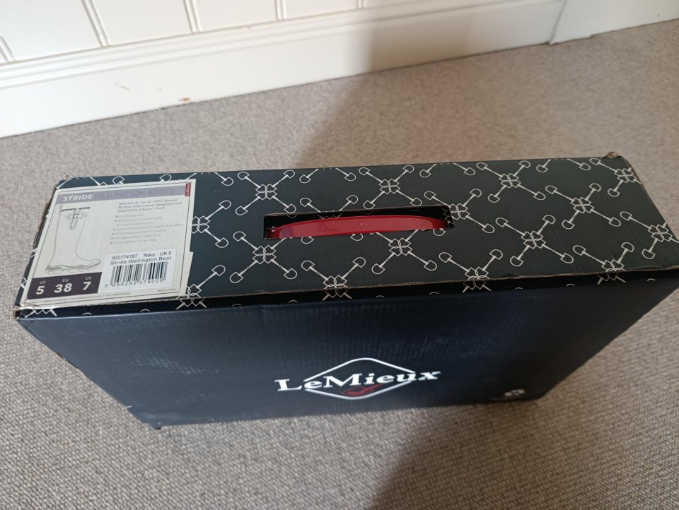 BRAND NEW (in box with tags) LeMieux Stride Neoprene ladies Wellington boots - ideal Christmas gift. Navy blue size 5 (ladies). Never even tried on - wrong size given as a gift by mistake.LeMieux Stride Wellington Boots are designed to handle any weather, from travelling across fields to mucking out the stables in the winter. They're composed of 100% natural rubber and have a tread form inspired by a horse's foot. Your feet will be supported throughout the day thanks to a moulded, cushioned gel silicone insole and insulating neoprene lining for warmth, giving you with all the comfort you need for riding, strolling and working in the garden.These tall wellies are entirely waterproof, stable friendly, and fully adjustable to fit your calf for added protection. Deep treads for greater traction and sturdy outer soles allow you to walk confidently, even through deep puddles and muddy terrain.Bargain at £35No timewasters please. Tel: 07932 063707