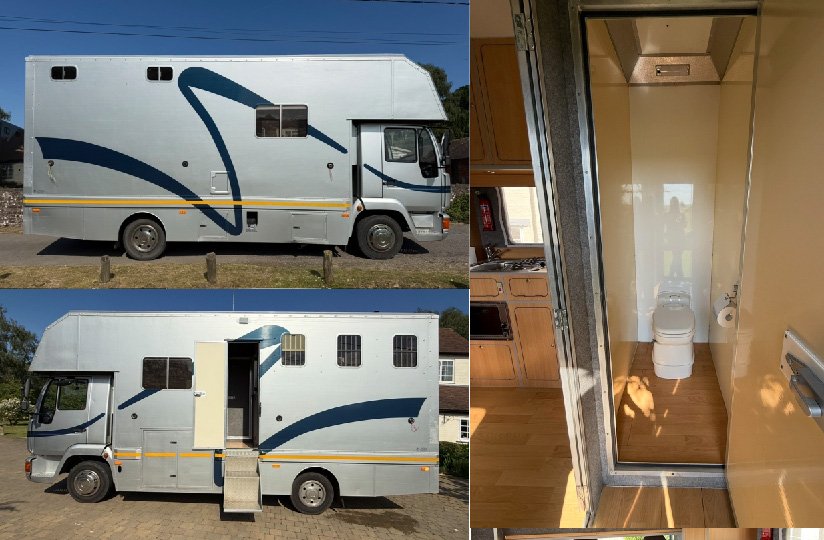 Much loved and well-maintained MAN 7.5 ton horsebox with Plating valid until August 2026. Stalled for three herringbone with a payload of 1.7t takes three smaller or two large horses, back ramp, cut-through cab, living quarters, gas oven, leisure battery, toilet, three front seats with seat belts, and a double bed in the Luton. With a total length of 24 feet she's a compact lorry with tilt cab, horse wash and tack locker.183,754Km driven. £10,000.