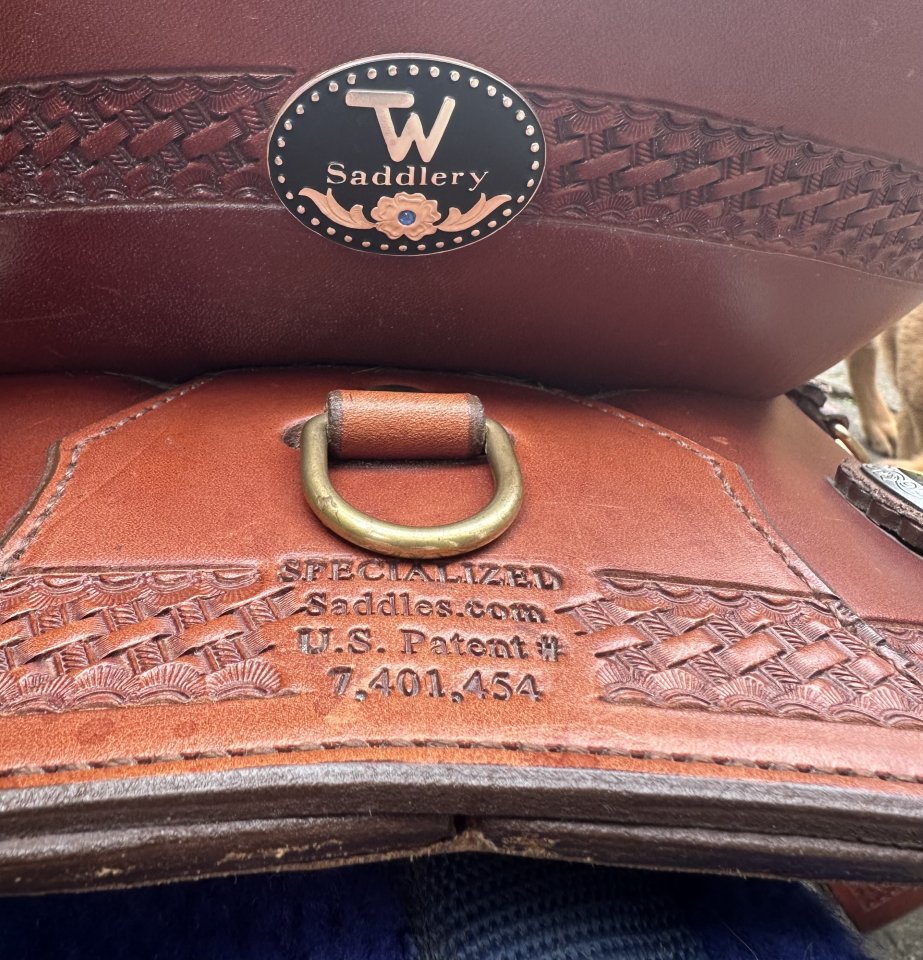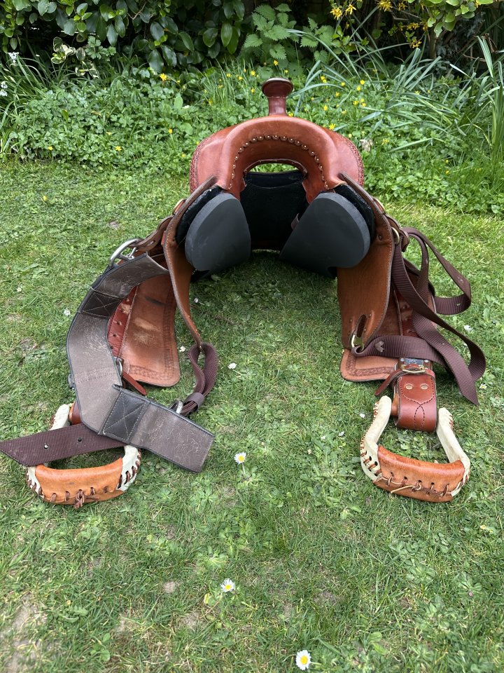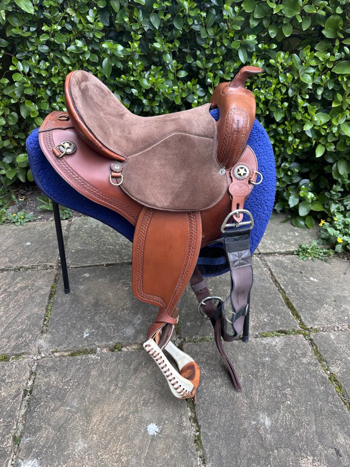 TW Saddlery Trail Light 15” brown western saddle with suede seat.Only used a handful of times so in fantastic condition.Incredibly comfortable, lightweight saddle - only 17lbs. It comes with a 24” flexi cinch and blue saddle pad.https://twsaddlery.com/product/trail-light-saddle/£1600
