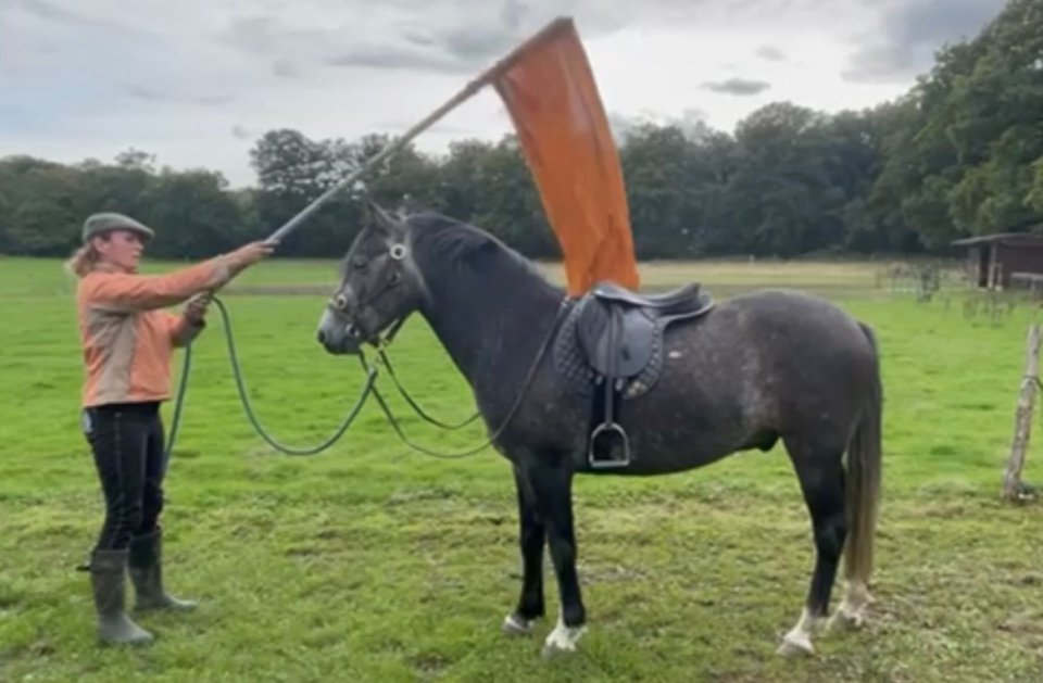 He's well desensitised to weird human life, umbrellas, flags, flappy stuff. My dog comes out on every ride w us and he lives on a pheasant shoot - so is very good for stuff jumping out under his feet. And best of all - I taught him a useful mounting block pickup trick which is super useful!