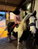 She is easy to handle, clip, shoe and load. She has lovely feathers, we usually clip them off and keep her more streamlined. She has had her teeth routinely done, with no issues. Easy with other ponies and can hack out on her own and in company. She is good in all traffic, happily hacks alone or with others through cattle and a busy farm.