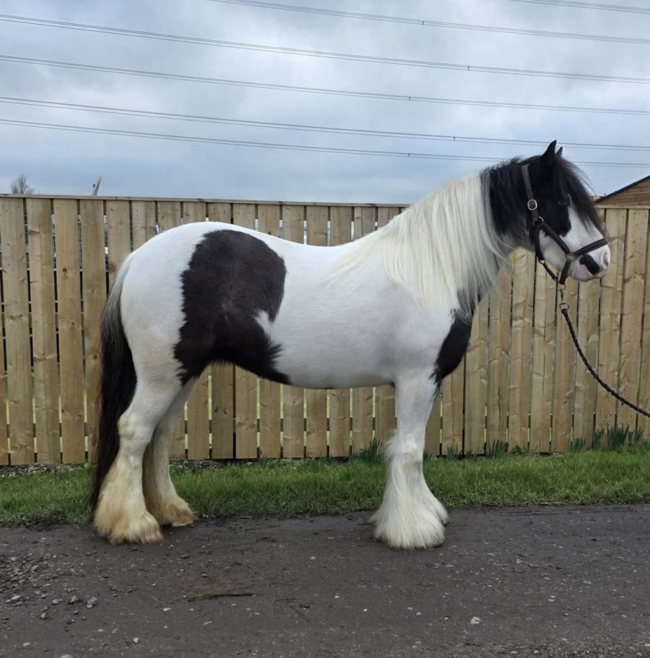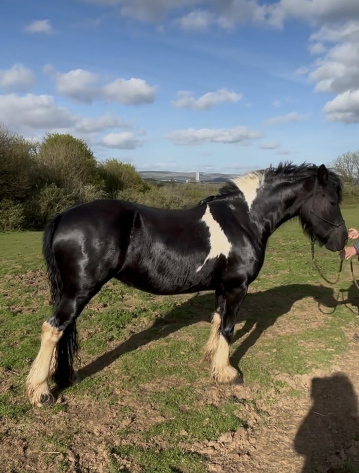 14/14.1 5 year old piebald cob mare. As wide as she is tall. Absolute sweetheart. Walk, trot and canter in the arena. Will pop a small jump. Super to hack, on the roads etc will go for miles. Snaffle mouthed A pleasure to look after goes in or out, loves to be groomed, washed etc no vices. Up to date with vaccinations etcPlease WhatsApp for a video Cobs like her are getting hard to come by £7500