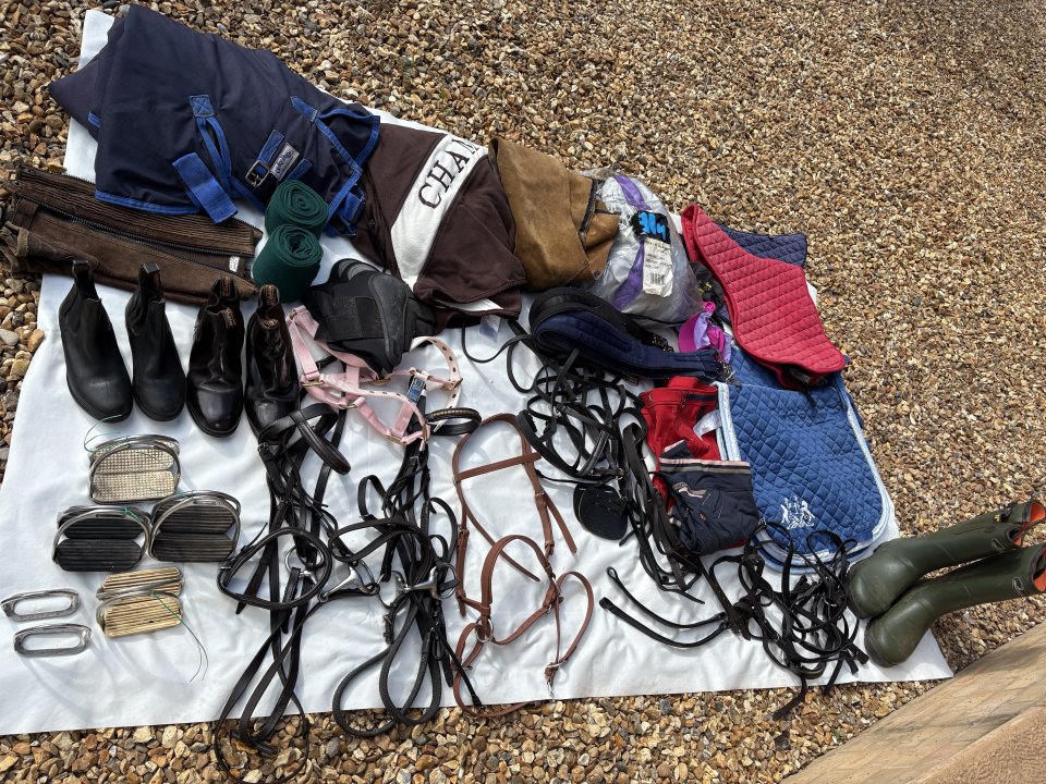 2 114cm girths £5 each 1 87cm girth £5 1 91cm black girth £5 1 “Dinky rugs” Shetland blue £10 1 fleece rug 5’6” brown as new £10 Set 4 dark green travel bandages £5 2 pony bridles currently with snaffle bits 13cm + 12cm £20 each 1 brown bit less bridle cob £15 Selection of pony nose bands (offers) 1 set girth guards new £4 2 pony running martingales £5 each Adult half chaps brown suede £5 Jodhpur boots brown size 6 £5 Jodhpur boots black child size 1 approx £10 1 leather foal slip £4 3 5” stirrups £5 each 1 43/4 stirrups £5 1 10cm child stirrups £5 3 pairs brushing boots medium (offers) Ladies brown suede full chaps £10 5ft fly rug a little rust stain, sound £5 Selection pony pads £5 each 2 Premier Equine jodhpurs navy and red size 10/12 £10 each Pink pony head collar (offers) Gents green country shooting boots 12 as new £40