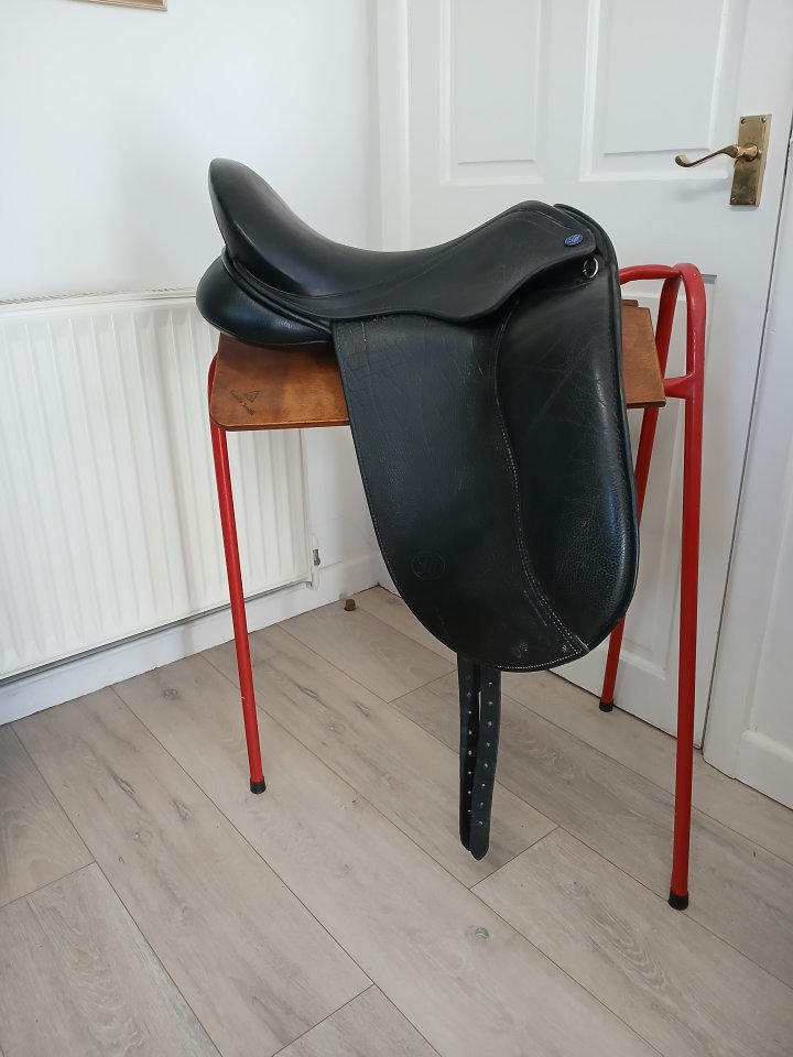 Lovely dressage saddle in excellent condition. Size 4 (Medium Wide) with buffalo leather flaps. Hardly used but sadly doesn't fit my new pony. No scratches or marks - always kept in the house. Really comfortable.£400