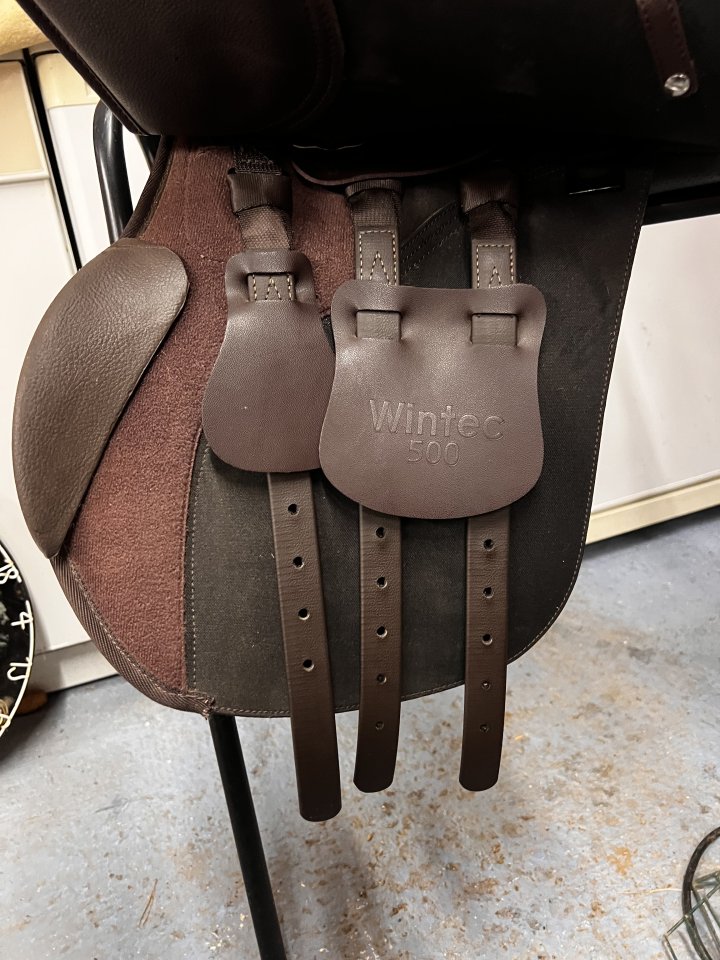 Wintec 500, like new condition Brown synthetic leather 17" Currently has a white (x-wide) bar in (red bar (wide) also available separately) Easy change gullet system Really soft panelling This saddle is like new, only used lightly for 2 months. No scuffs, marks or discolouration Girth straps unmarked Comes with blue Wintec saddle cover. A beautiful, comfy saddle that sadly doesn't fit my ever growing youngster! Looking for £375 Ono- collection from Braishfield or central Romsey Please text or email if interested:) More photos available!