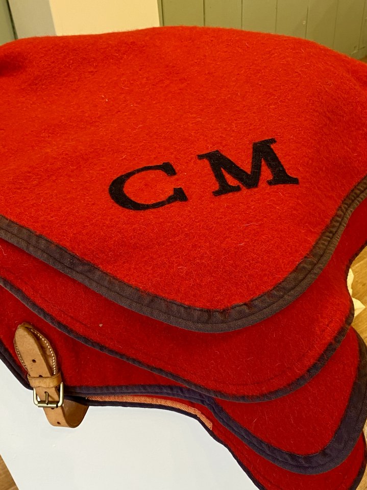 Fleece stable rug, red with navy trim, leather buckle, 5’, monogrammed CM, vgc as new - £20