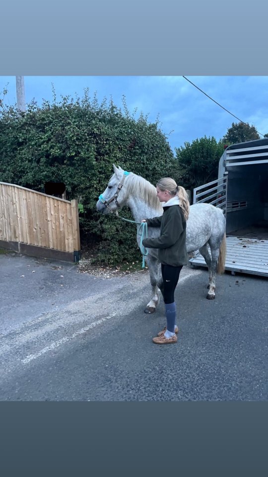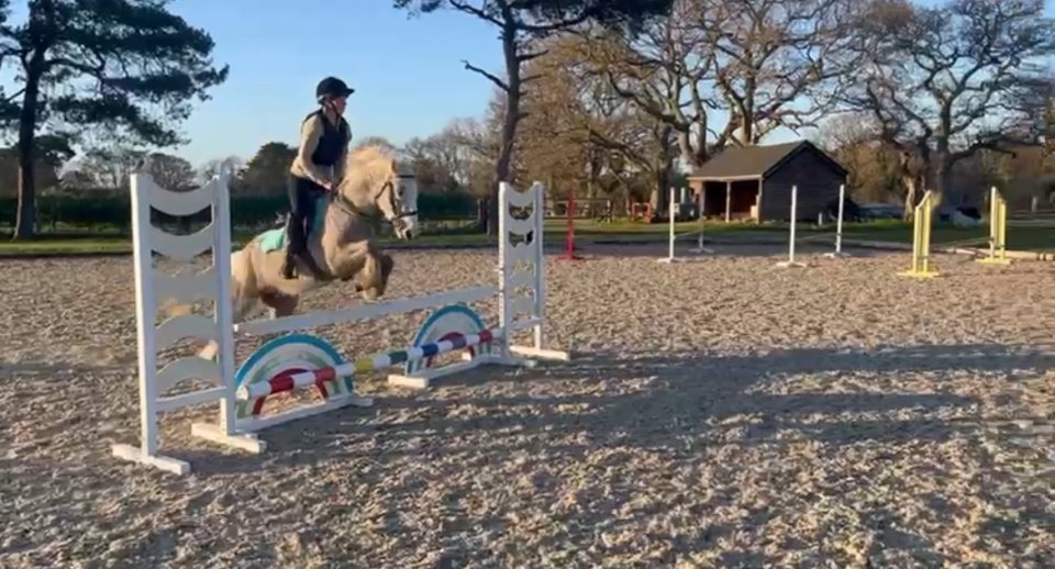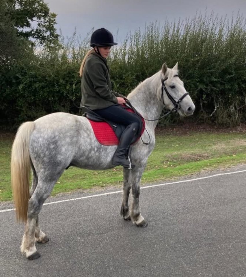 He hacks out alone or in company. Has done a little bit of jumping and a few cross country jumps showing potential. Lives out 24/7 with or without company and easy to handle. Will make a good pony!