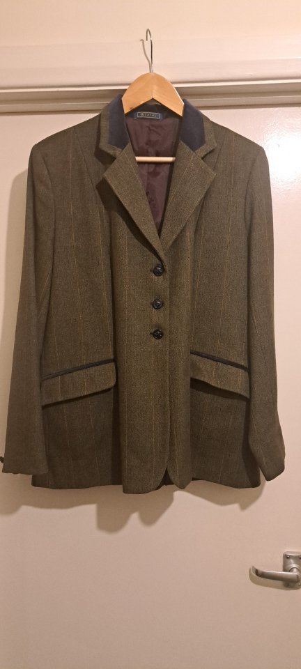 This has been worn by me once for an in hand showing class. I prefer the colour of my other jacket on me. When I purchased it it was an ex show stock jacket so only ever tried on not worn for any length of time this shows in the condition of the jacket.Still has it's lightweight plastic bag from new. With the size and name sticker on the outer.Would like £60.00 Also advertised on Ebay.Any questions please ask.